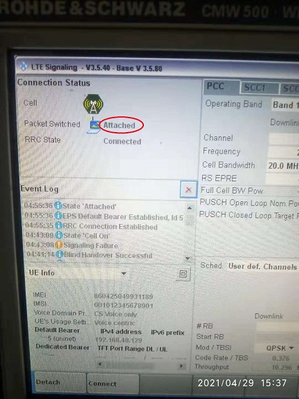 5.打开CMW综测仪的“ON/OFF”开关,等待被测设备注册于CMW500综测仪