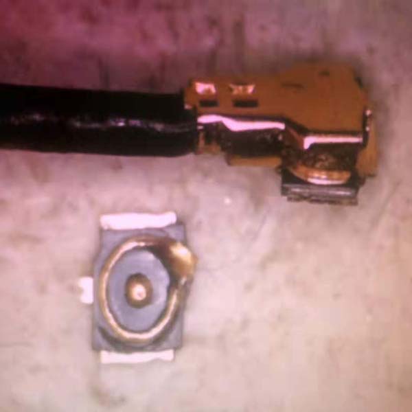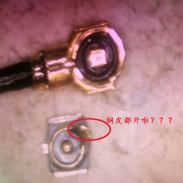 首件还是用老方法,确认不良---用IPEX端子进行适配,发现确如客户所说:插不进板端,立马上干货,用CCD进行放大分析,发现客户的天线座已经被插拔变形了.再次用手掰铜皮,发现铜皮较软,初步确认是材质问题
